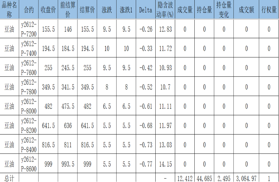 豆油期权全日成交12412手,持仓44685手,持仓量增加2495手,行权1手。
