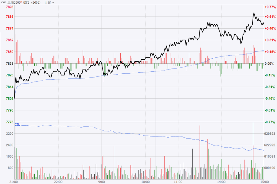 当日(20251230)豆油期货市场整体呈现震荡上涨走势。主力合约y2605收于7878元/吨,较上个交易日上涨40元/吨,成交量为209400手,持仓量为619542手,持仓量减少16826手。