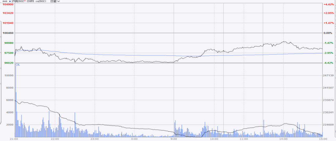 周一,COMEX铜价大幅回落;周二(20251230)沪铜延续调整,主力2602合约,盘中最低至96010元/吨,最终收盘价在98090元/吨,较上一交易日收盘价下跌770元/吨,跌幅0.78%。