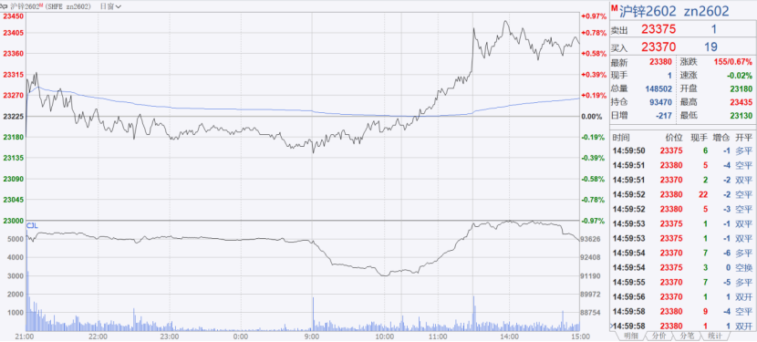 截至2025年12月30日收盘,沪锌期货市场呈现窄幅震荡走势。主力合约(2602合约) 报收于23380元/吨,较前一交易日上涨155元/吨,涨幅0.67%。