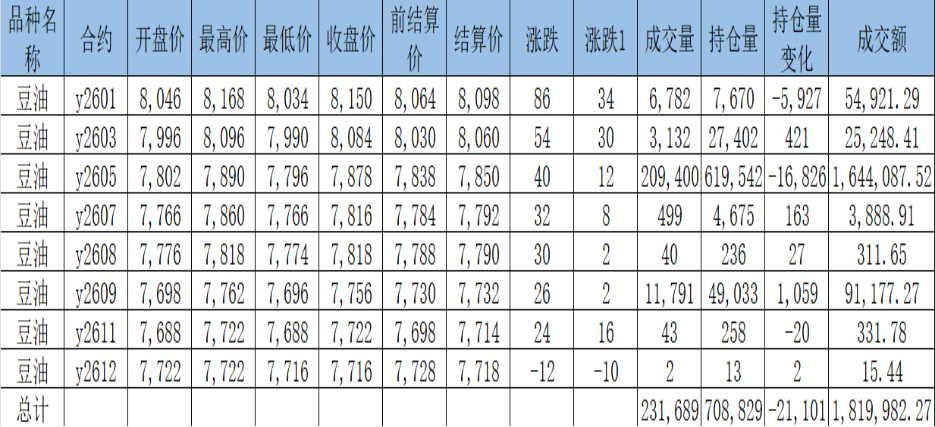 豆油合约总成交量231689手,总持仓量708829手,较前日减少21101手。