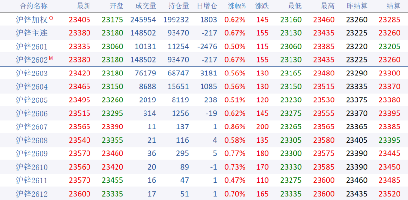 当日沪锌期货12个合约,品种持仓量199232手,较上一交易日增加1803手,其中主力合约zn2602,持仓量减少217手。