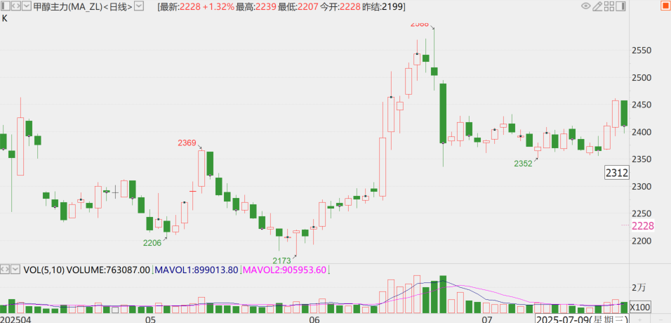 中美贸易战缓和甲醇小幅反弹,到6月中旬伊以冲突,伊朗甲醇装置全部停车,进口减量的预期下甲醇价格大幅反弹,但地缘影响短暂,伊朗甲醇装置快速回归,甲醇价格冲高回落。