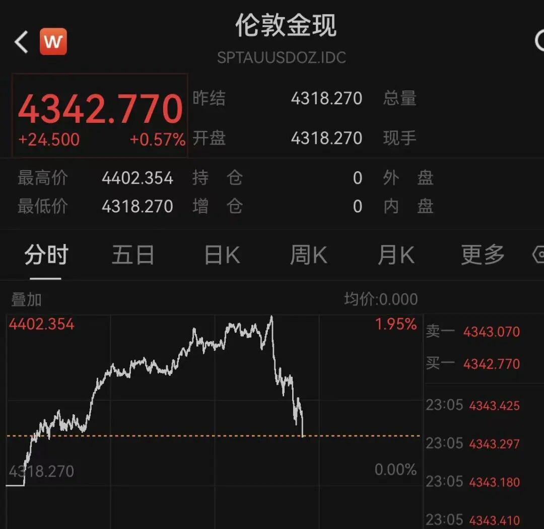 黄金方面,截至发稿,现货黄金突然回落,不过仍保持在4340美元上方,今日曾一度突破4400美元。此外,现货白银也回落至74美元下方。