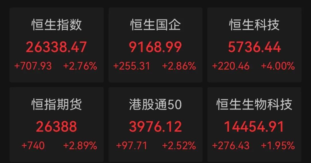 华虹半导体涨超9%,中芯国际涨超5%;科网股上涨,百度集团涨超9%,网易涨超6%,阿里巴巴、腾讯控股涨超4%。