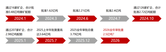 1月23日,印尼镍矿商协会(APNI)透露,2025年镍矿开采配额总量已达2.98亿湿吨,高于去年的2.72亿湿吨。这成为引发市场供应预期修正的第一个关键时点,部分奠定了镍产业全年“供过于求”的主基调。