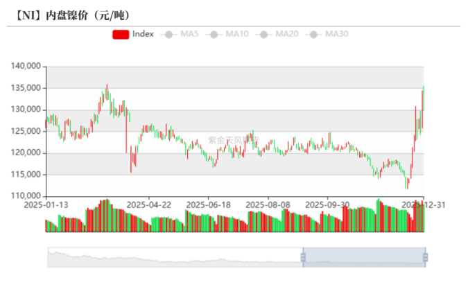 12月中旬以来,印尼接连释放的政策端重磅信号,点燃了本次年末行情,扭转了市场的悲观预期;详细分析可见此前文章 云评论|镍:强势回归 。我们认为,在镍价已经历深度回调、估值压缩至历史低位的背景下,市场对供应端任何潜在扰动信号都异常敏感,进而引起了价格的快速反弹。截止12月31日,镍价最高反弹至135570元/吨,较年内最低点上涨约21.4%。