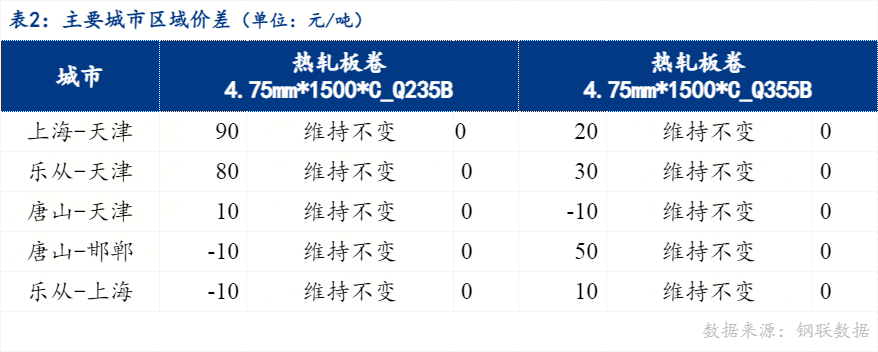 从区域价差来看,4.75mm普卷华南与华北价差80元/吨,华东与华北价差90元/吨,华南与华东价差-10元/吨。京津冀地区价差来看,唐山与天津价差10元/吨,唐山与邯郸价差-10元/吨。