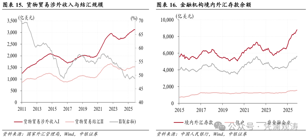 银行结售汇保持平稳,市场主体结汇意愿仍然偏弱,境内外汇存款余额创新高,警惕升值预期增强诱发结汇需求集中释放