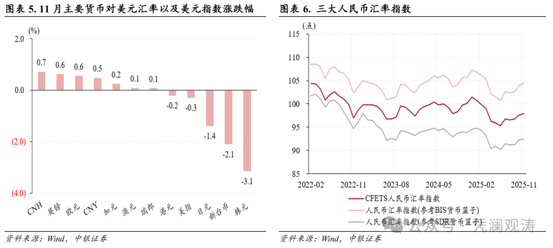 2025年前11个月,人民币实际有效汇率指数累计下跌3.2%,叠加中国货物贸易顺差规模突破万亿美元大关(见图表17),招致了国际社会对中国汇率政策的关注。多家外资机构认为人民币汇率存在低估,并且以美国前财政部官员布拉德.塞策为代表,认为人民币升值可以提振收入进而刺激消费和服务业,以此为由呼吁人民币大幅升值。