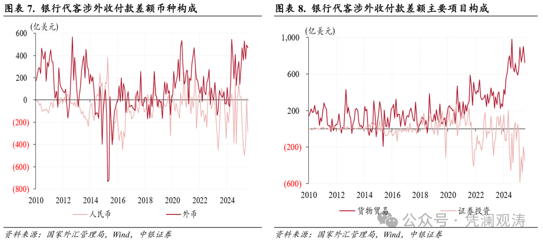 分项目看,货物贸易涉外收付款顺差环比减少175亿至727亿美元,但仍处历史高位,是跨境资金主要净流入渠道;证券投资涉外收付款为连续第六个月逆差,逆差规模环比增加146亿至346亿美元;货物贸易和证券投资分别贡献了银行代客涉外收付款顺差环比降幅的52%、44%(见图表8)。