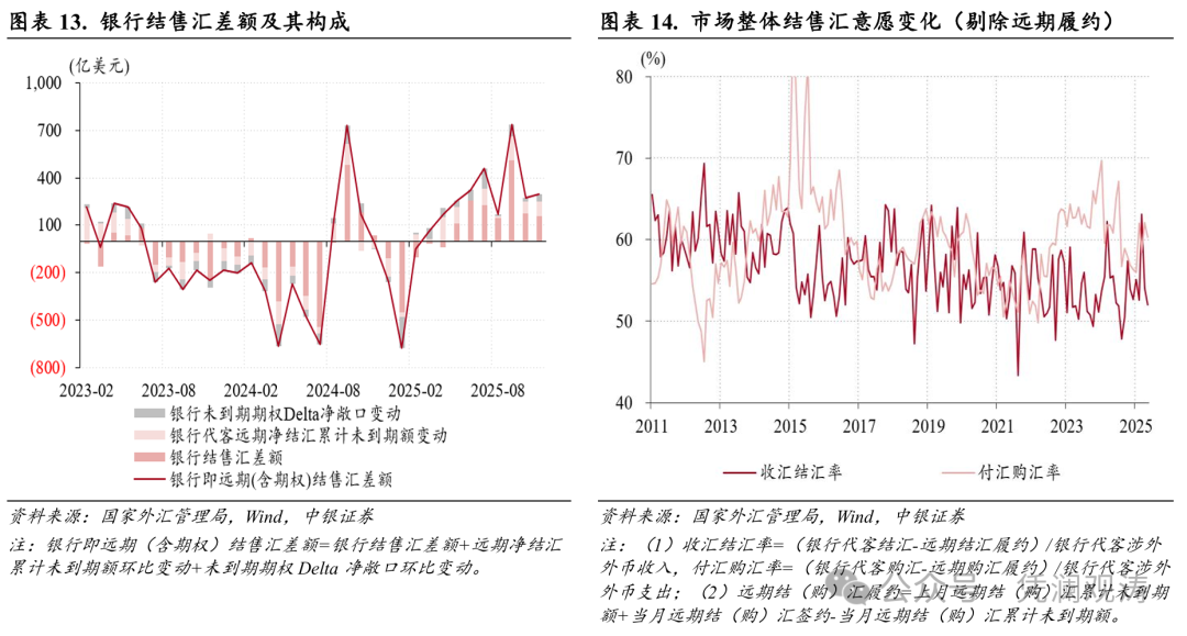 11月份,货物贸易项下,海关统计的贸易顺差环比增加216亿至1117亿美元,为历史第三高,与可比口径的涉外收付款顺差缺口扩大至+381亿美元。不过,从12个月移动均值看,2024年下半年以来,伴随着人民币贬值压力缓解,出口收款加快、进口付款放缓,导致货物贸易“顺差不顺收”状况总体趋于改善(见图表9、10)。