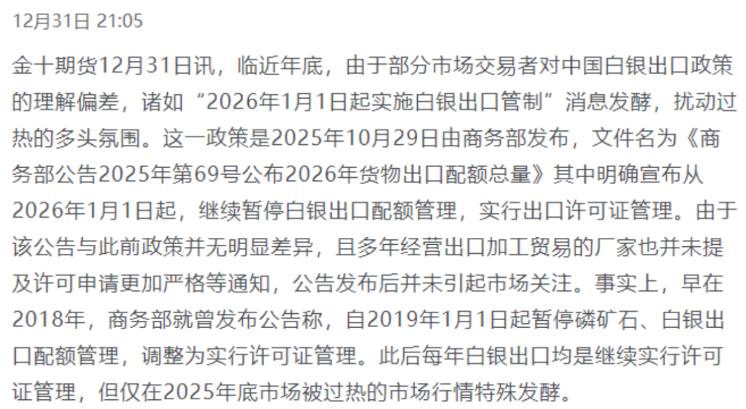 关键在于“继续”二字。资料显示,中国对白银出口实行许可证管理并非新政,而是自2019年1月1日起就已实施的既定管理框架,此次公告仅是年度的常规重申。