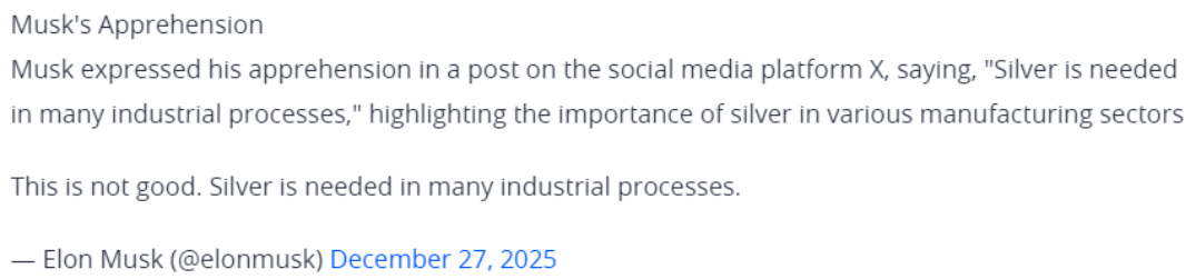 元旦假期,一则关于“中国将于2026年对白银实施更严格出口管制”的消息在全球大宗商品市场与舆论场中不胫而走,引发高度关注与讨论。甚至有人搬出世界首富马斯克2025年底的一条评论来佐证相关观点。