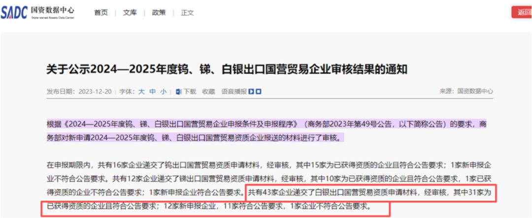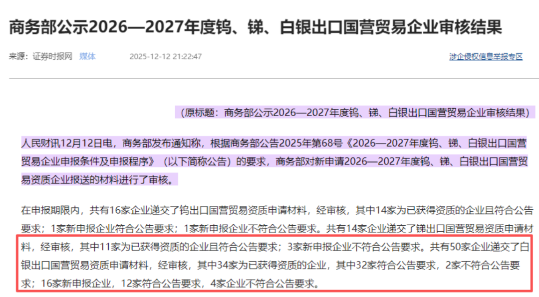 2026年,看到白银行业机会后,共有50家企业递交白银出口国营贸易资质申请资料,共有44家企业获批,实际上还增加了2家企业。