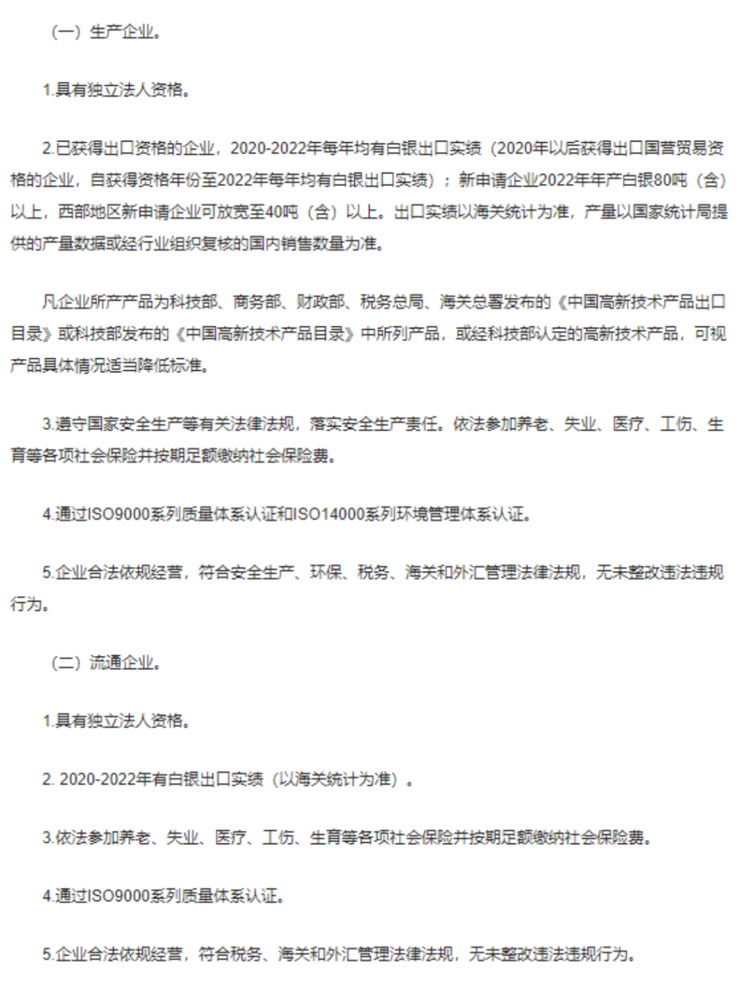 如果我们去对比商务部《2026—2027年度钨、锑、白银出口国营贸易企业申报条件及申报程序》和《2024-2025年度钨、锑、白银出口国营贸易企业申报条件及申报程序》,就会发现无论是生产企业和流通企业,其标准均无实质性改变。
