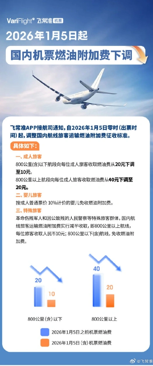 国内航线燃油附加费今起下调:800公里以下10元,以上20元