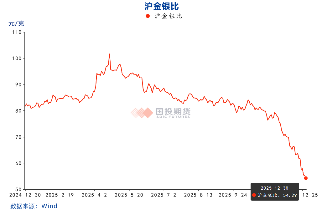 下跌的原因首先是多头过度拥挤,且获利盘丰厚,总体持仓结构较为脆弱,国内外白银年内均积累翻倍以上的历史性涨幅,期权波动率高达历史最高的82.6,期权历史最高的历史波动率暗示市场的拥挤程度之高。此外从白银估值体系而言,金价的上扬趋势和金银比继续下行的空间是下半年白银牛市的核心动力,但截至.12月29日,金银比已经跌穿年内最低的60,从4月以来金银比下跌幅度超过40%,金银比交易获利盘同样丰厚,利润兑现需求高企,从黄金来看,虽然圣诞节行情刚刚创历史新高,但短中期缺乏消息刺激,走势相对被动,由于流动资金的活跃性和规模来看,甚至隐隐有被动跟随银价走势的迹象。金银比和黄金价格的驱动均缺乏主动性,导致银价上行趋势表现外强中干,叠加持仓拥挤和后续小长假、商品基金年初调仓的隐忧,国内外白银多头获利盘开始抢跑,并引发短期的多杀多踩踏行情。