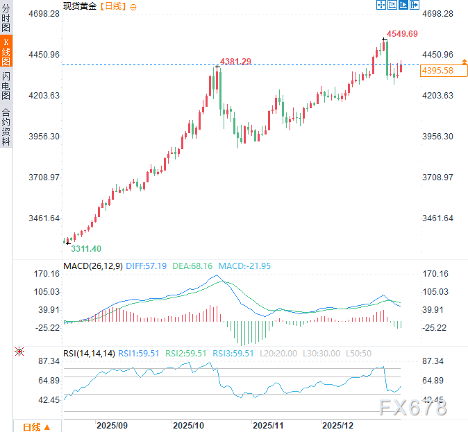 周一(1月5日)亚市时段,现货黄金震荡上行,涨幅约1.6%。