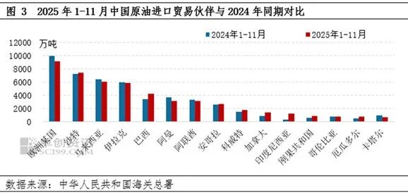 中国原油进口延续多元且不均衡的特点,近年来,受到特朗普关税引发国际贸易争端、地缘加剧石油贸易调整等因素影响,中国自亚太、东欧等周边地区友好国家的进口量增长明显,与此同时,适度减少部分国家的原油进口量。结合数据来看,在中美贸易争端持续存在的大背景下,2025年1-11月中国自美国进口原油229万吨,较去年同期缩减73.8%,占比份额进一步下降至0.4%,其中,6-11月份连续6个月自美国零进口。基于进口来源多元化特点,中国自美国进口减少的数量,被其它部分友好国家快速补齐,尤其是像马来西亚、印度尼西亚、加拿大等,与中国的原油贸易量增长明显,也确保了中国原油市场的稳健运行。