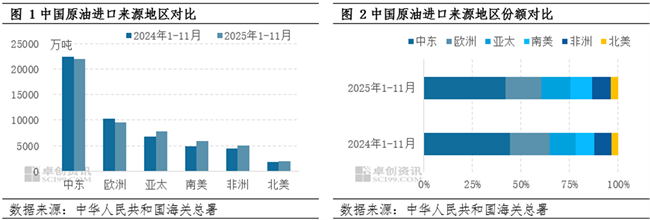 2025年中国原油进口来源依然主要集中在中东及欧洲地区,但受到全球石油贸易流向调整等因素影响,中国自上述两个地区的进口量较去年同期有所减少。1-11月份数据来看,中国自中东地区进口量减少2.0%,至22020万吨,占比份额下降2.3个百分点至42.2%;自欧洲地区进口量减少7.3%,至9513万吨,占比份额下降2.1个百分点至18.2%。
