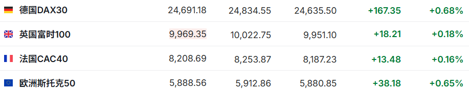 2. 截至发稿,德国DAX指数涨0.68%,英国富时100指数涨0.18%,法国CAC40指数涨0.16%,欧洲斯托克50指数涨0.65%。