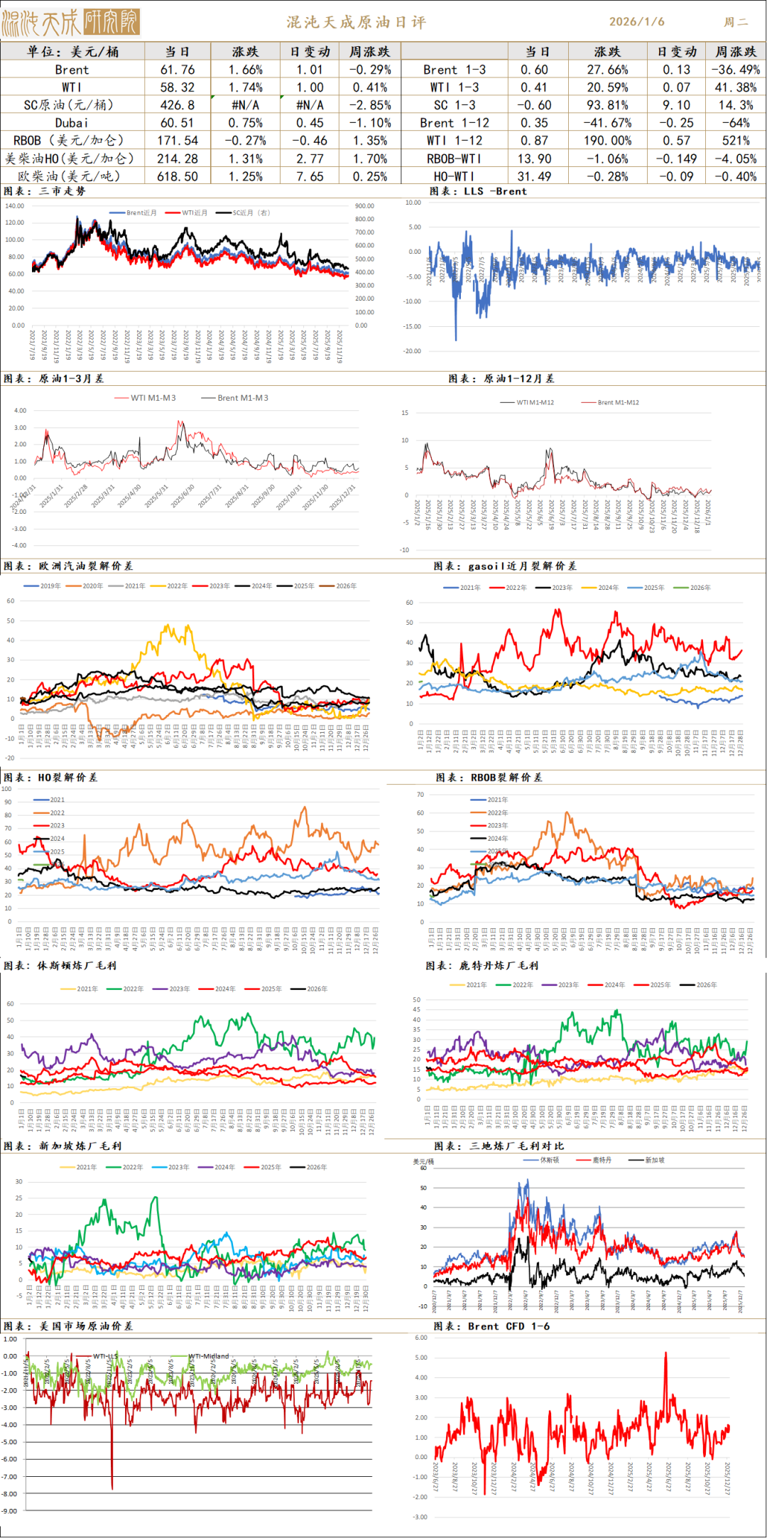 供应端:OPEC+在新一轮会议上维持产量不变,主要干扰仍在地缘。美国攻击委内瑞拉后,封锁仍在继续,供应恢复或需要时间,但局势进一步激化的可能性不高。伊朗国内局势混乱,且面临美国以色列威胁,因此地缘冲突对供应的潜在利多仍在。