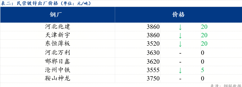 今日北方民营钢厂镀锌出厂指导价在3520-3860元/吨。