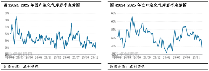 需求端方面,国内以醚后碳四市场为代表的需求市场走势先扬后抑,均价微幅上移。国际原油先跌后涨的波动对国内调油原料市场提振有限,行业整体维持低位震荡,市场情绪普遍谨慎;同时下游化工装置持续亏损,对高价原料接受度不足,成本传导受阻,进一步压制工业采购需求。民用端方面,丙烷燃烧需求受市场疲软态势冲击,多空因素交织下丙烷价格先涨后跌,虽外盘偏强支撑下半月跌幅收窄,月度均价仍高于11月,但下游补库意愿不佳。截至12月24日,全国LPG社会库容率为60.16%,较11月底微降0.25个百分点,仅靠冬季价格相对坚挺支撑买方维持基础库存,库容整体变动不大。预计1月市场支撑减弱,社会库容率或继续走低。