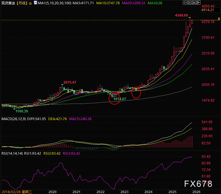 (现货黄金月线图,圈处为俄乌冲突,巴以冲突的关键时点)