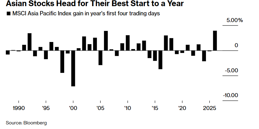最新统计数据显示,MSCI亚太基准指数(MSCI Asia Pacific Index)在2026年开年之后的股票市场交易日里累计上涨约4%,势将创下该基准指数自1988年有记录以来最为强劲的年初交易日表现,其中韩国和中国台湾股市领涨,港股与A股市场则不甘示弱,强劲的涨势紧随前两者其后。衡量该地区主权货币的一项指标录得自2023年以来最佳年度开局,而以美元计价的亚洲市场公司债基准指数也实现同步上涨。