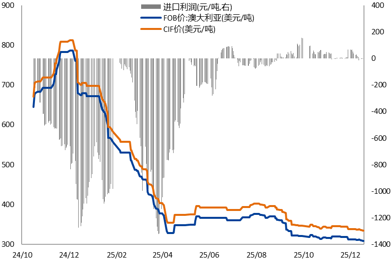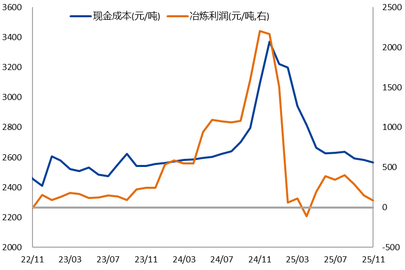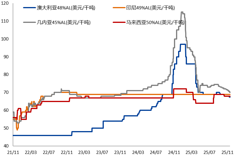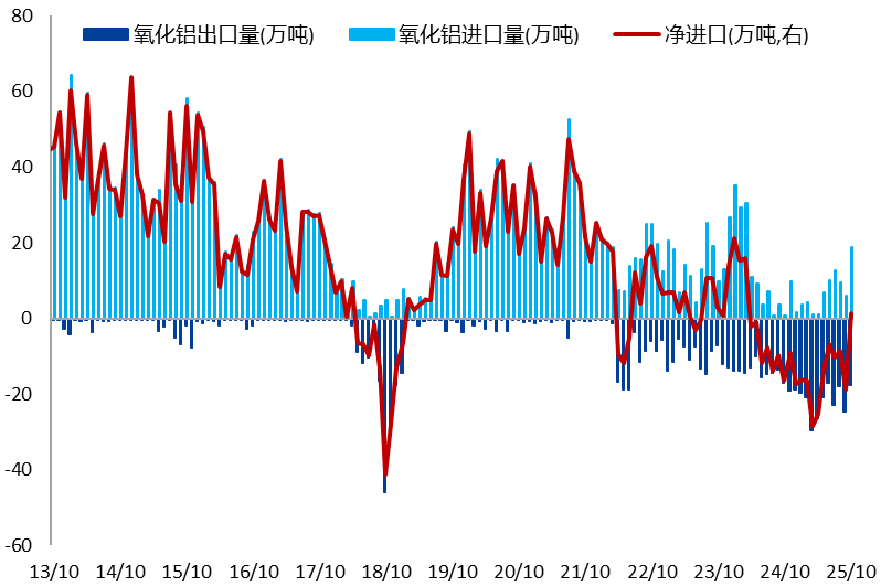 海外氧化铝也处于过剩格局,2025年9月起,海外氧化铝价格出现加速下跌,进口窗口一度打开。从国内氧化铝进出口数据来看,1-9月始终维持净出口状态,但10月氧化铝转为1.36万吨的净进口。部分海外氧化铝企业仍具有一定的成本优势,因此净进口格局有望延续,海外低成本氧化铝对国内供给预计存在压力,对价格形成拖累。