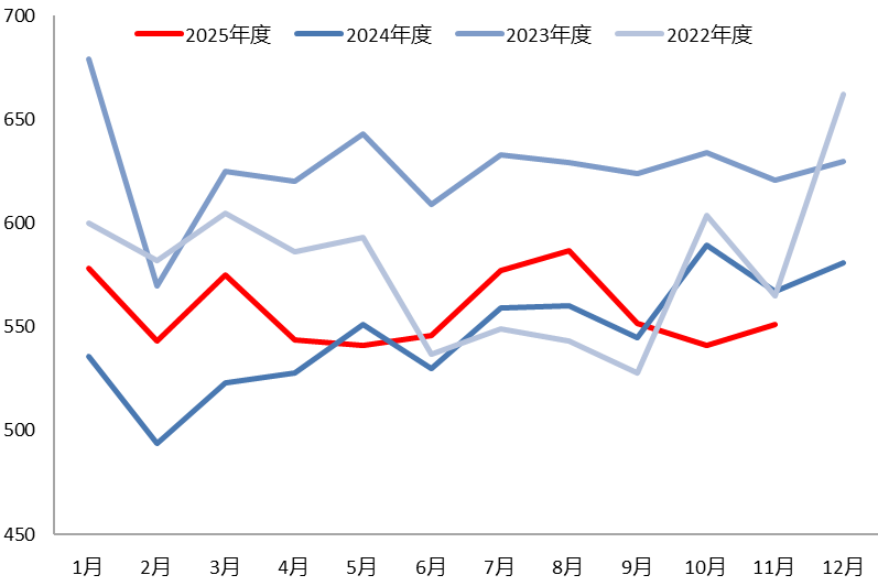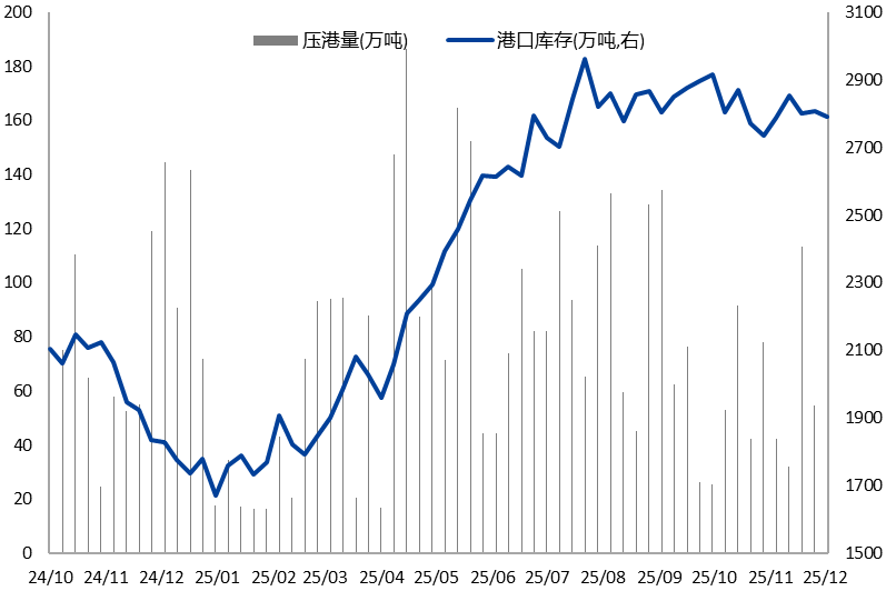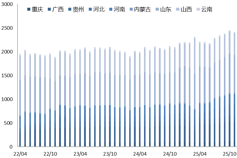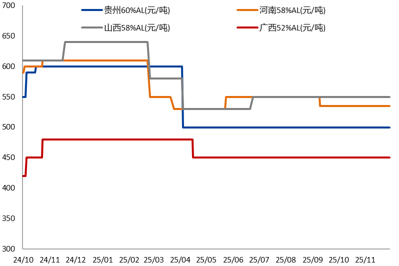 另外2025年国内铝土矿进口明显增速,2025年1-10月铝土矿累计进口1.71亿吨,同比增长30.41%,进口矿和国产矿供给高于氧化铝生产需求量,因此国内铝土矿港口库存及厂内库存均处于偏高水平,截至11月末,铝土矿库存超过5200万吨,能满足国内2个月左右的氧化铝生产需求。