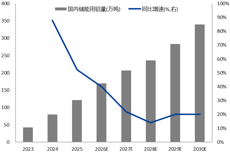 电网系统建设转型,特高压、储能支撑电子电力需求增长。“十五五”是我国能源转型的关键期,基于“双碳”目标构建新型电力系统目标明确。其中电网系统升级,尤其是特高压工程建设是铝需求的稳定支撑。根据机构测算,“十五五”期间特高压年均开工量或在“4直2交”,其中直流线路每公里用铝量约55-60吨,交流线路每公里用铝量约60-65吨。根据单条直流线路2500公里、交流线路800公里进行测算,“十五五”期间特高压年均用铝量在39-85万吨之间。新型电力方面,光伏装机量高增速预计难维持,但储能建设或将接力,为需求提供新增长。根据《新型储能规模化建设专项行动方案(2025—2027年)》中目标,预计三年内全国新增装机容量超过1亿千瓦,2027年底达到1.8亿千瓦以上,2030年有望达到3亿千瓦。根据SMM数据,每1GWh储能系统对应的铝材消耗量约为2310吨,储能用铝量有望从当前的121万吨增长至339万吨。