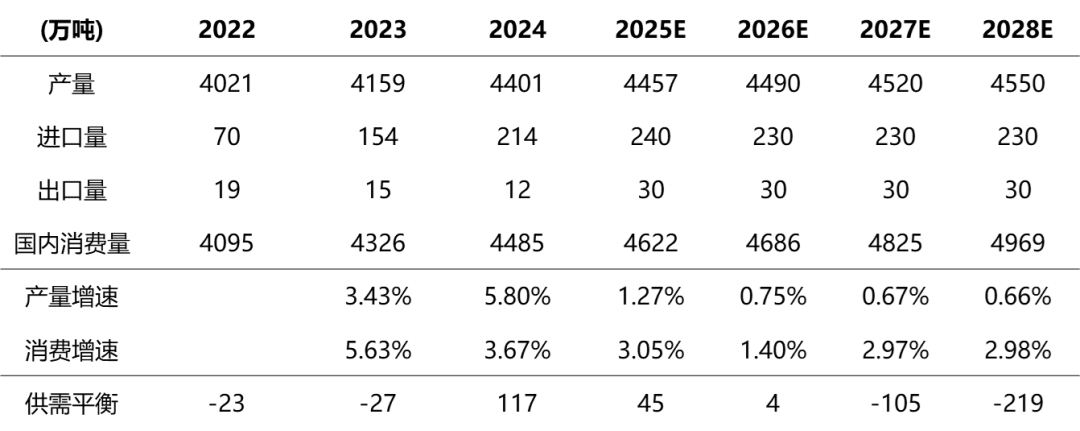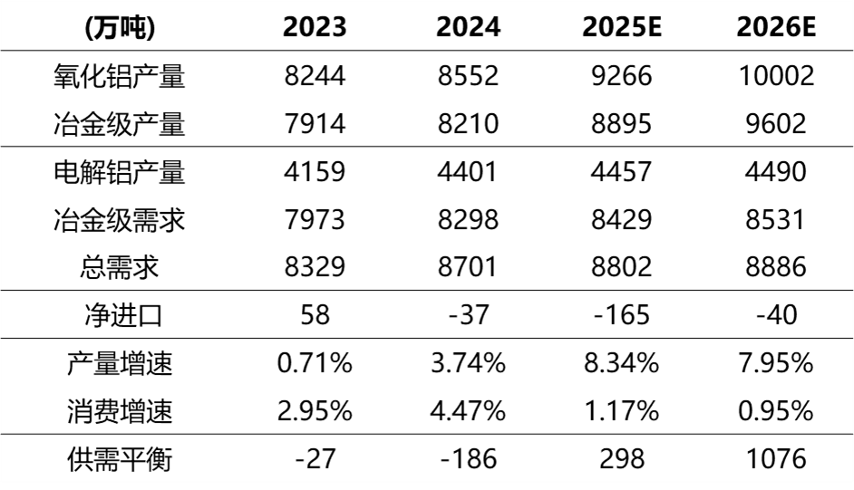 国内电解铝产能在政策制约下,难有增长,海外产能投放存电力拖累,且当前进口利润大幅倒挂,因此国内电解铝供给难有增长空间。下游需求随着终端消费结构的调整,新兴领域需求占比预计将不断抬升,总需求仍将保持增长。因此供给刚性、需求向上的供需结构明确,供需平衡在2026年-2028年期间,预计将为4万吨、-105万吨、-219万吨;由当前的小幅过剩转向紧缺,且供需缺口将逐步扩大。