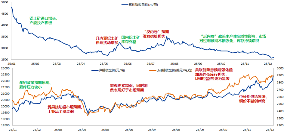2025年沪铝与氧化铝价格呈现明显分化,电解铝强势、氧化铝弱势。一季度受到贸易关税等宏观因素影响,电解铝价格先上后下,围绕20000元/吨附近运行。进入二季度后,全球宏观面边际好转,叠加美联储降息等金融属性向上驱动的强化,铝价持续走高,冲破22000元/吨关口,刷新2022年下半年以来的高点。年末宏观驱动有所减弱,价格维持震荡。电解铝全年基本面维持偏紧预期,宏观面对价格影响增加。而氧化铝则全年走弱,价格从2024年末5000元/吨附近持续下跌至2500元/吨下方。年初受铝土矿供给充裕、国内产能持续投放等因素影响,开启跌势。5月受几内亚部分矿区停产、政府收回采矿许可证等事件的影响,价格短期反弹,但氧化铝产能由于利润改善不减反增,价格重回弱势。年中受“反内卷”等政策预期的影响,价格运行至年内高点,但由于政策实质性影响较为有限,氧化铝过剩格局未有转变,在进入7月后价格重回跌势,并持续走低至成本线附近,不断刷新上市以来低点。