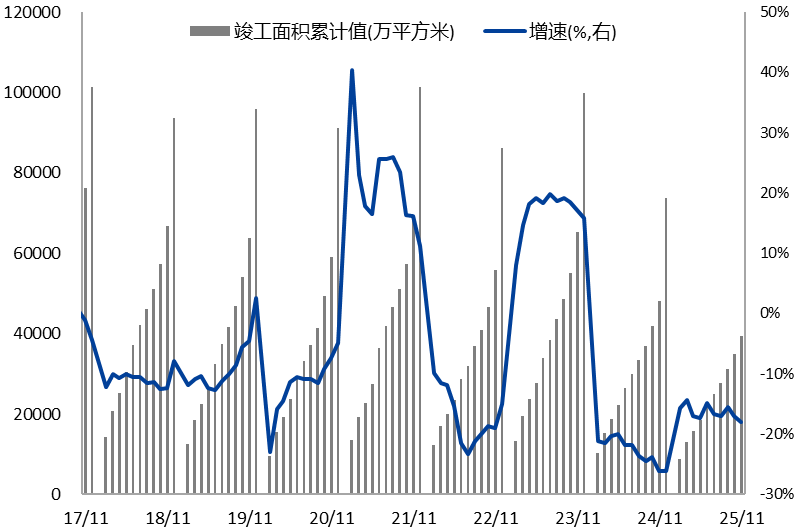 传统需求拖累减弱,占比逐年下降。建筑曾是电解铝下游最主要需求,在过去较长一段时间内稳定在30%以上的水平。但近年来随着地产需求的逐年下滑以及其他领域需求的增长,占比持续回落,2024年建筑需求占比已下行至20%附近。展望2026年,地产相关用铝量预计仍将延续跌势,但在稳增长政策环境下,地产增速下滑趋势正在逐步放缓,2025年1-11月国内地产竣工面积累积增速为-18.6%,新开工面积累积增速为-20.01%,均较上一年跌幅减弱,因此地产用铝需求下滑节奏预计将逐步放缓。家电板块受地产后周期影响,终端消费需求进一步向下空间较为有限。