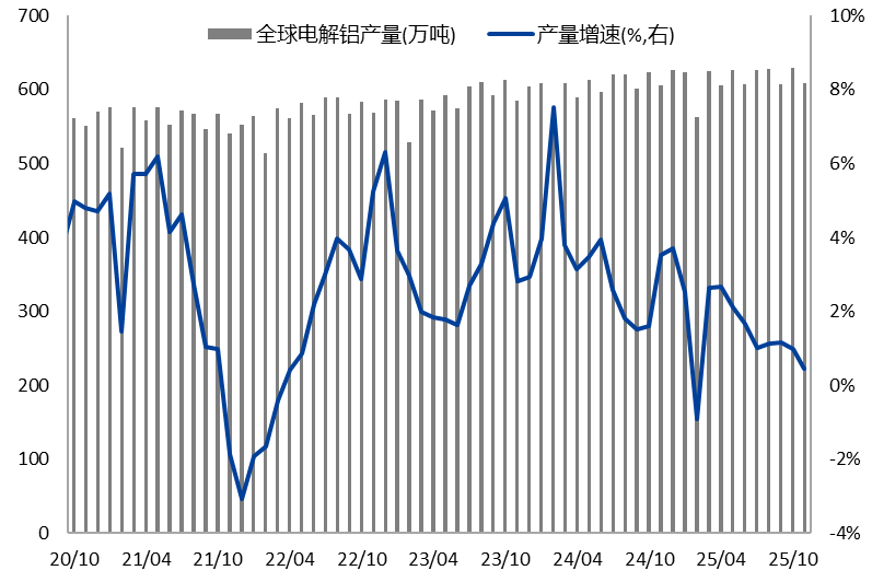 海外方面,市场增量预期主要来自于印尼,包括中资企业项目在内,2025年-2030年海外产能新增项目将超过1000万吨,但海外项目实际投放进度偏缓,根据SMM数据显示,2025年全年运行产能较2024年仅增长50万吨,国际铝业数据显示2025年1-11月产量同比增量94万吨。另外欧美地区存在部分复产预期,目前市场对2026年产量增长预估普遍在100万吨左右。但电力因素将加剧海外电解铝供应的脆弱性,拖累项目投产、复产进度,2025年世纪铝业、SOUTH32、力拓等企业均出现因电力问题引发供给担忧。