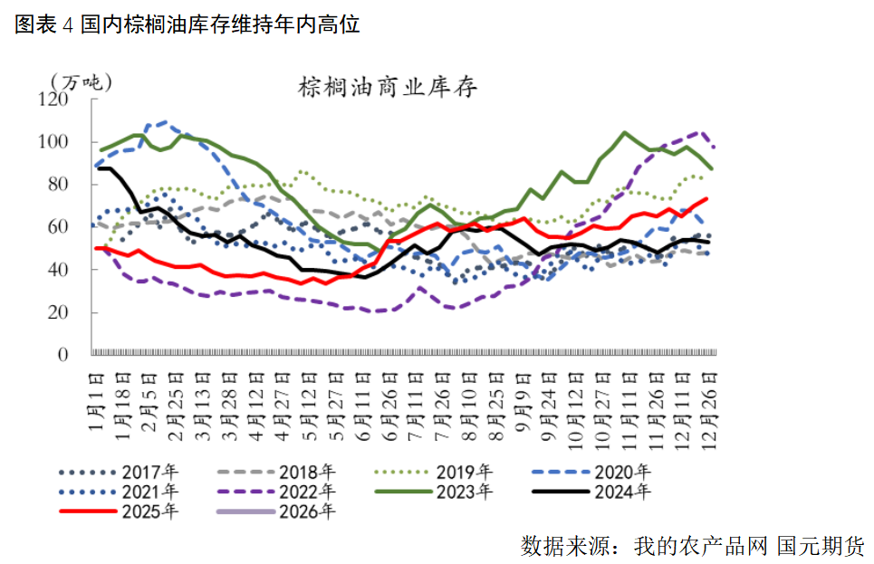 2025年12月下旬以来,马来西亚棕榈油供需延续供强需弱格局,累库压力持续凸显且短期难以缓解。高频数据显示,12月SPPOMA口径棕榈油产量环比减少8.07%,MPOA显示12月前20日产量环比降7.44%,路透、彭博均前瞻12月产量约176万吨,环比跌幅超9%,虽处季节性减产周期,但产量仍为2018年以来同期高位,供应端收缩幅度不及市场预期。出口方面,船运机构数据分化,AmSpec与ITS显示12月全月出口环比分别降5.21%、5.76%,路透与彭博前瞻12月出口仅环比增1.7%-2.8%至123-125万吨,欧盟生物柴油政策推迟落地、原油价格疲软压制工业需求,出口改善幅度有限。MPOB报告前瞻显示,12月马棕库存或达297-299万吨,环比增4.7%-5.3%,创2019年2月以来新高。2026年MPOC预计产量温和增至1970万吨、出口达1620万吨,虽油棕树进入自然休整期,但初期减产幅度难抵高基数库存,一季度累库预期仍强,二季度后或随出口回升与减产深化逐步缓解。