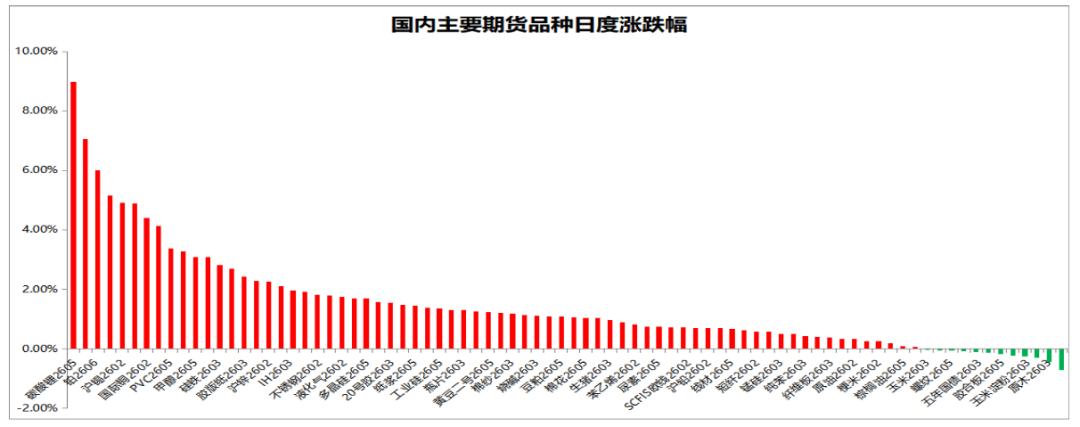 国内期货主力合约大面积飘红,碳酸锂涨停,沪银涨超7%,铂涨超6%,钯涨超5%,沪锡、沪铜、国际铜、沪镍涨超4%,PVC、沪铝、甲醇、苹果涨超3%,硅铁、双胶纸、沪锌、铝合金、菜籽涨超2%。跌幅方面,胶合板跌超1%,焦炭、原木小幅下跌。