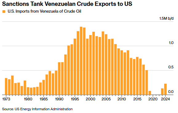 委内瑞拉国家石油公司的一家子公司曾参与多个合资项目,其中包括与Phillips66在得克萨斯州斯威尼的炼油厂合作,直接向工厂供应原油,同时以Citgo品牌运营自家设施。目前,这些进口中的一小部分仍流向美国,雪佛龙、PBF、Phillips66和瓦莱罗近期均有采购。