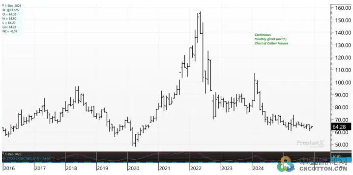 从过去十年的棉花期货价格走势看,2016-2019年,棉花期货价格在每磅60美分至90美分的区间波动。2020年新冠疫情爆发后,由于市场对需求萎缩的担忧加剧,棉花期货价格一度跌至每磅48.35美分。疫情结束后,全球需求回暖,加之2021年投资者掀起大宗商品抢购热潮,推动棉花价格在2022年飙升至每磅156.64美分的历史高位。这一峰值出现在俄乌战争开始后不久,当时棉花与谷物、油籽等大宗商品价格同步攀升。此后价格开始持续回落,目前棉花期货价格已跌至每磅64美分左右。
