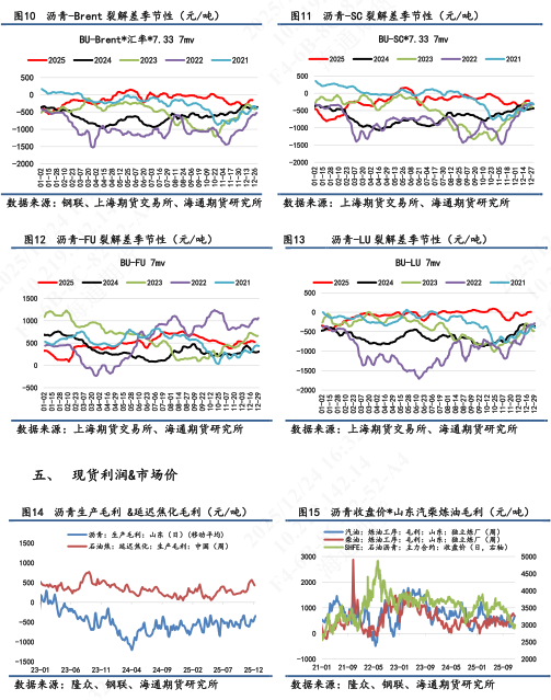 【3】裂解变化:①BU-Brent录得-71元/吨,7天累计+46元/吨。当日BU主力+0.27%;Brent+0.2%(以下午3点收盘成交价计算)。目前油价受委内瑞拉地缘扰动影响,短期价格企稳后仍具有不确定性。沥青层面作为油价的对冲难度要大一些,裂解差持观望看待。