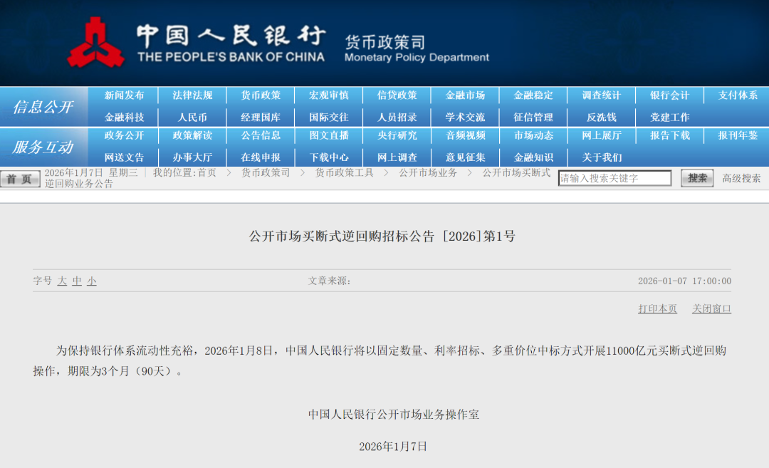 1月7日央行公告,为保持银行体系流动性充裕,2026年1月8日,中国人民银行将以固定数量、利率招标、多重价位中标方式开展11000亿元买断式逆回购操作,期限为3个月(90天)。