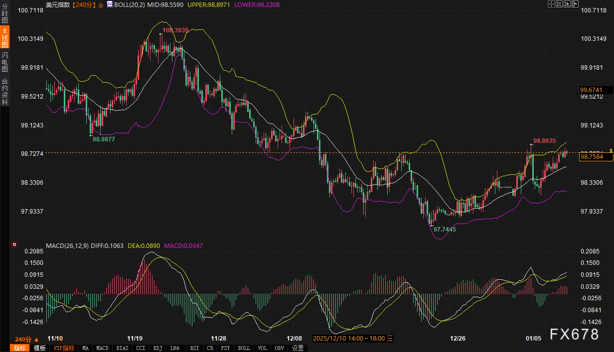 从市场结构观察,美元指数4小时图显示价格目前运行于布林带中轨98.5593与上轨98.8973之间,MACD指标中DIFF线0.1065略高于DEA线0.0890,呈现微弱多头态势。然而,这种技术面上的稳定与基本面上北约内部裂痕的扩大形成了鲜明对比。分析人士指出,若格陵兰岛争议持续发酵,可能导致欧洲资本重新评估美元资产的安全性,特别是在欧元区与美国的政策分歧日益显性的背景下。