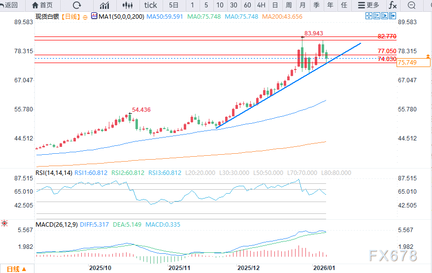 汇通财经APP讯——周四(1月8日)美盘时段,现货白银大幅下跌,跌破关键的50%回撤水平77.05美元。这一走势带来的下行动能使市场处于测试74.03美元上升趋势线的位置。该指标自11月21日的主要低点48.64美元以来一直为上涨趋势提供支撑。尽管趋势线首次被测试时可能出现技术性反弹,但一旦跌破,将使上一个摆动低点70.07美元重新成为焦点。
