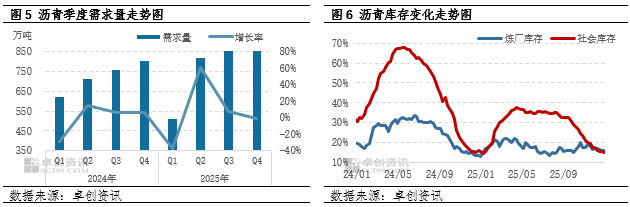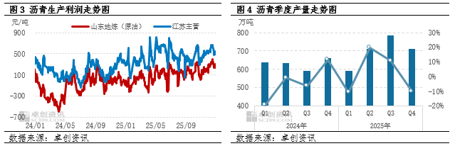 据卓创资讯数据测算,四季度地方炼厂原油配额生产沥青的理论利润均值为231元/吨,较三季度利润均值增加85元/吨,涨幅为58.22%,原油配额生产沥青的综合利润整体维持偏高位水平,地方炼厂沥青生产延续较高的积极性。不过,四季度柴油行情阶段性走强带动炼厂焦化效益改善,部分炼厂降低沥青排产、开启焦化装置,导致四季度沥青产量较三季度出现下滑。四季度中国沥青产量预估值为711万吨,环比减少81万吨或10.23%。虽然四季度沥青产量环比减少,但产量仍高于25年季度平均水平,产量的下滑对沥青价格支撑明显不足。此外,沥青产量下滑主要集中在北方地区,而南方地区沥青资源依旧过剩,施压南方沥青价格。
