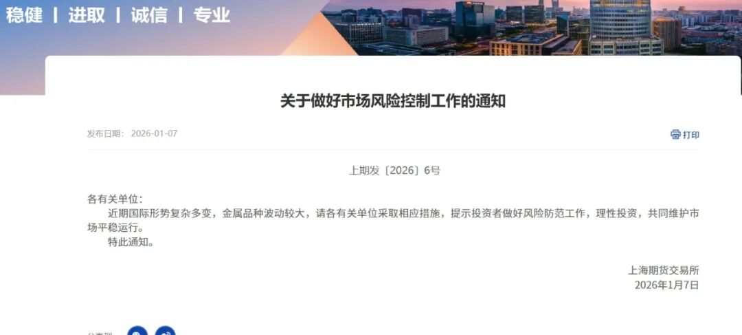上期所在《关于做好市场风险控制工作的通知》中称,近期国际形势复杂多变,金属品种波动较大,请各有关单位采取相应措施,提示投资者做好风险防范工作,理性投资,共同维护市场平稳运行。