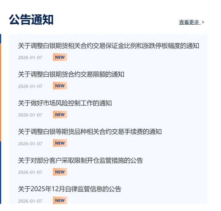 《关于调整白银期货相关合约交易保证金比例和涨跌停板幅度的通知》称,经研究决定,自2026年1月9日(星期五)收盘结算时起,交易保证金比例和涨跌停板幅度调整如下:白银期货AG2601、AG2602、AG2603、AG2604合约的涨跌停板幅度调整为16%,套保持仓交易保证金比例调整为17%,一般持仓交易保证金比例调整为18%。
