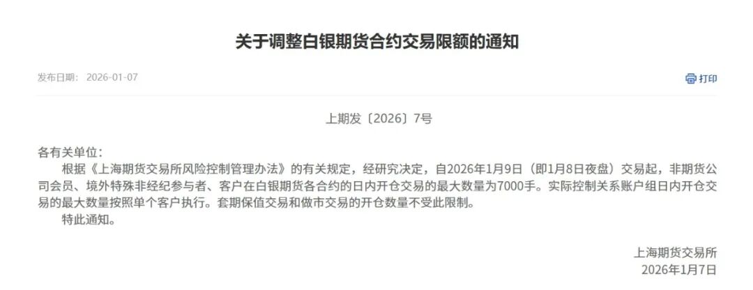 《关于调整白银期货合约交易限额的通知》显示,根据《上海期货交易所风险控制管理办法》的有关规定,经研究决定,自2026年1月9日(即1月8日夜盘)交易起,非期货公司会员、境外特殊非经纪参与者、客户在白银期货各合约的日内开仓交易的最大数量为7000手。实际控制关系账户组日内开仓交易的最大数量按照单个客户执行。套期保值交易和做市交易的开仓数量不受此限制。